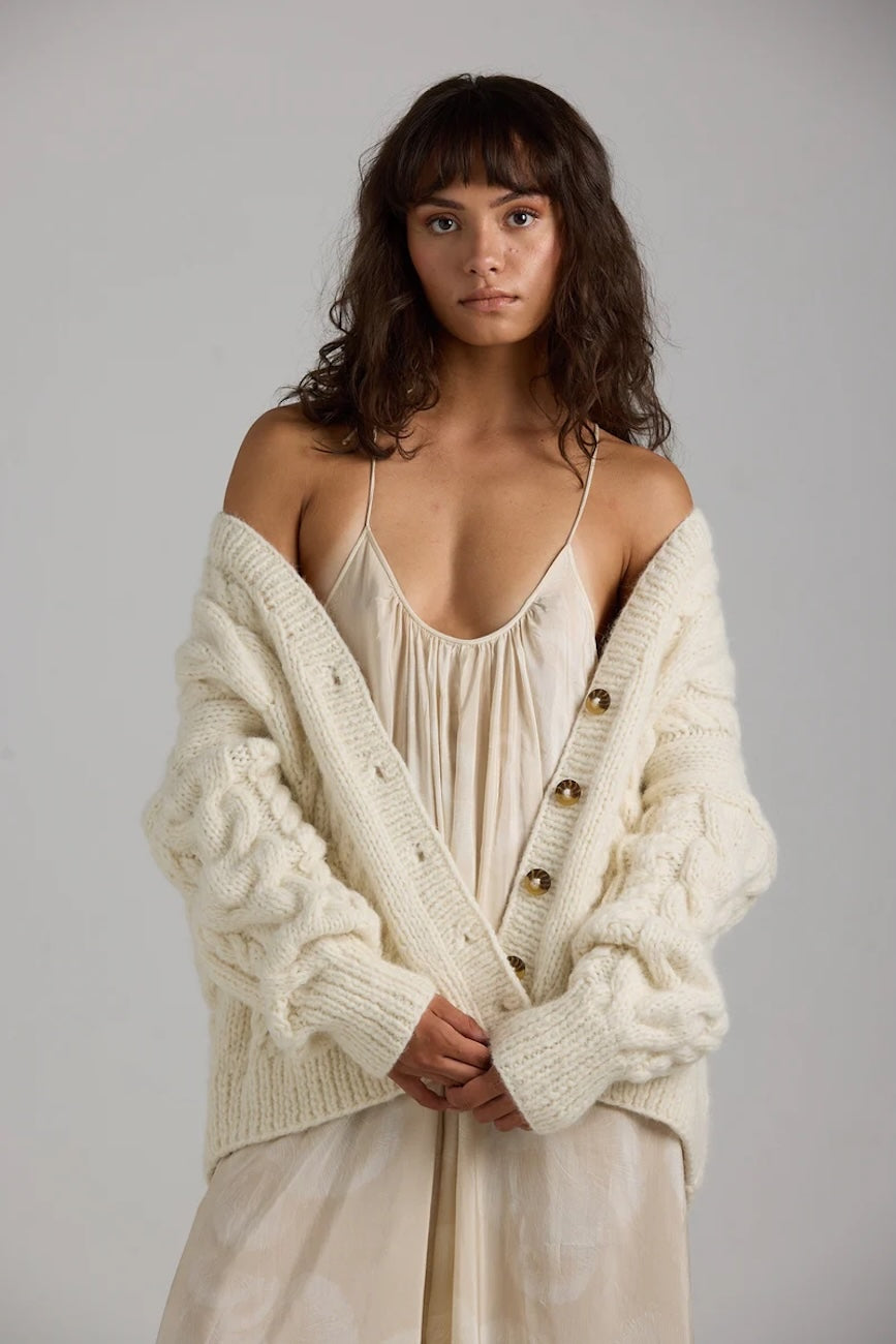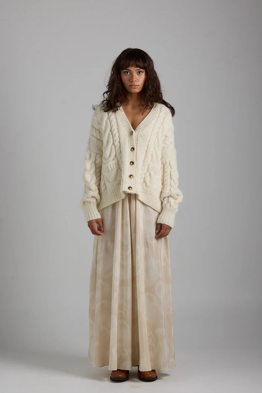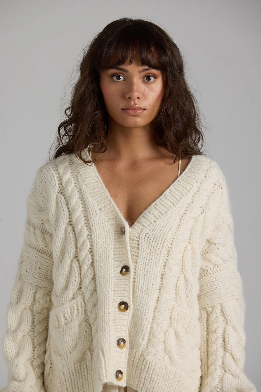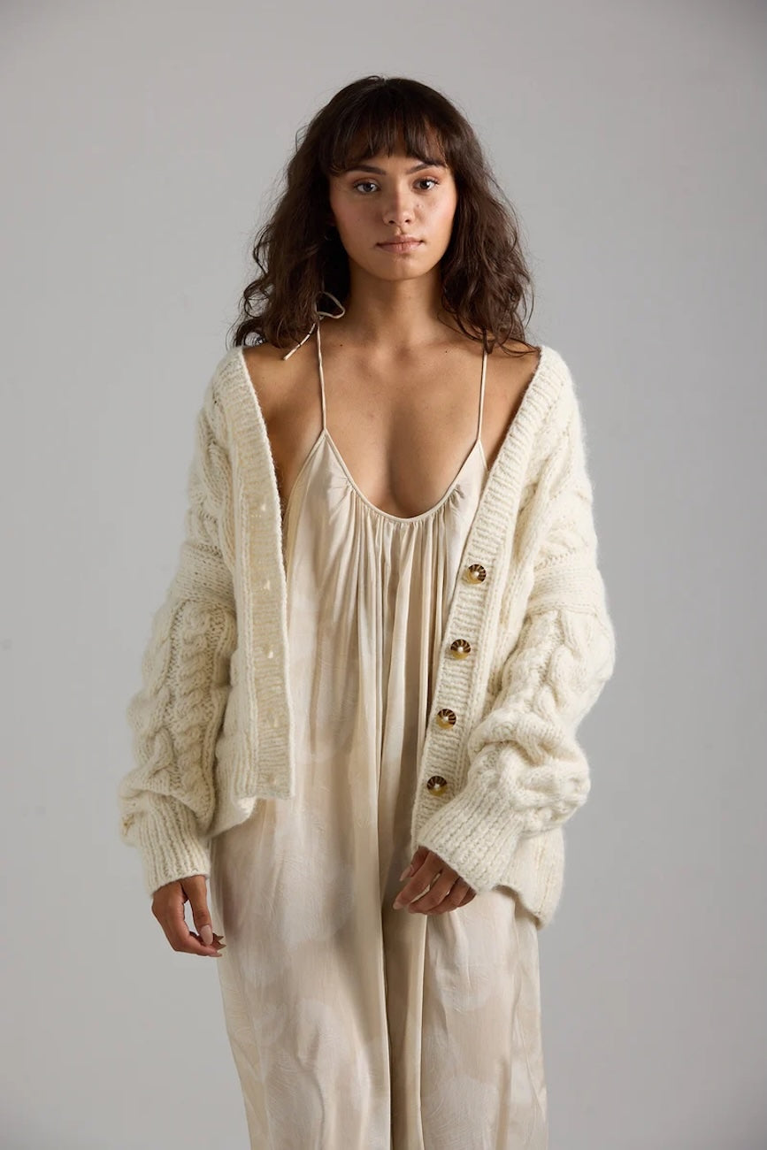 Paris is a timelessly elegant, cable stitch cardigan—crafted for comfort and elevated in design. Meticulously hand-knitted from the finest 100% Baby Alpaca yarn, it features a relaxed, oversized silhouette with classic front button detailing. Every stitch is a tribute to slow, intentional craftsmanship.